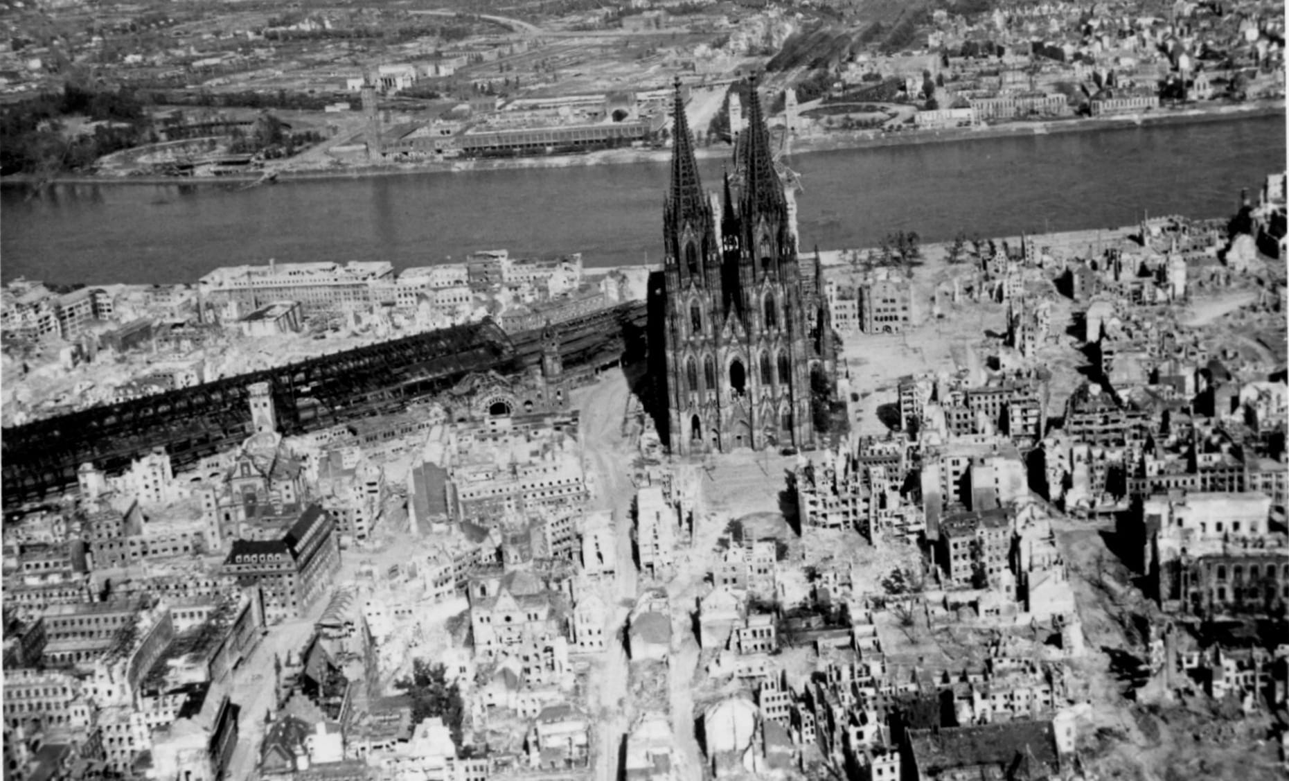 Und im 15 km entfernten Köln zertrümmerten die alliierten Bomber ab 30.05.1942 erfolgreich 60% der Innenstadt und töteten tausende Personen, besonders Frauen und Kinder.